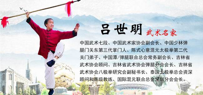 吕世明,一九四五年生于吉林省长春市,祖籍山东登州府蓬莱县吕家娘娘庄,中国武术七段、中国武术家协会副会长、中国少林弹腿门关东第三代掌门人、陈式心意混元太极拳第二代关门弟子、中国潭/弹腿联合总会常务副会长、吉林省武术协会顾问、吉林省武术协会弹腿分会会长、吉林省八极拳研究会副秘书长、关东民间传统武术队队长、河南“孟州武术学院”名誉院长、“泰国太极拳总会”资深顾问和高级教练、“国际混元联合总会深圳分会”会长、“深圳市武术协会八卦掌研究会”顾问,国际混元重庆开州分会高级顾问等。