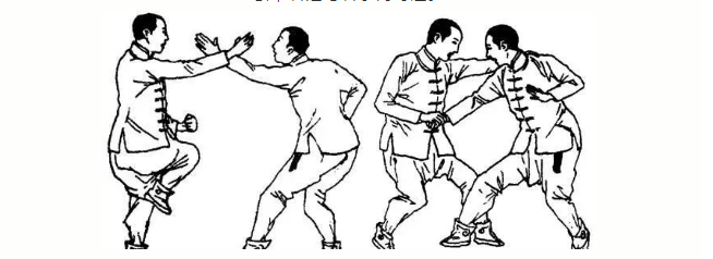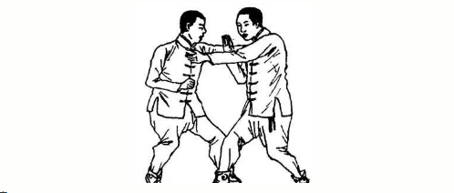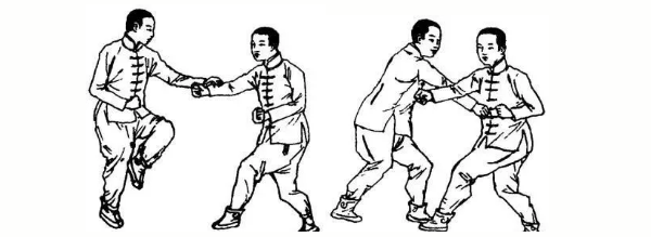 乙即速先向后撤右足,左足提起,腿紧靠右腿,再将左手将甲之右手向外推去,即速进步还打崩拳