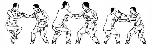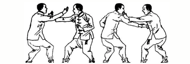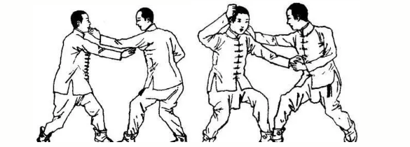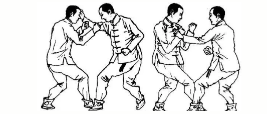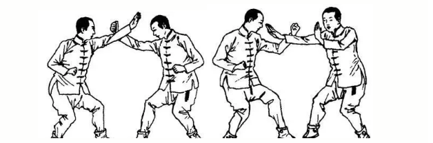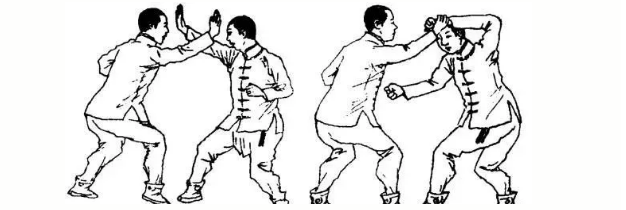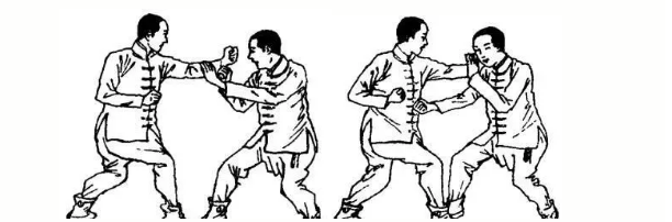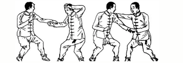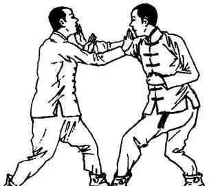 乙将左胳膊抽回在胁,右手随即速向着甲之左手里边钻去,两足不动。甲抽回左手在胁,右手随即向乙之左颊劈去,两足不动