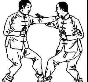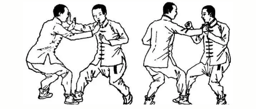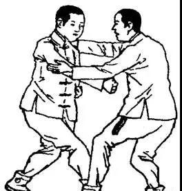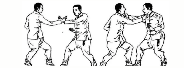 甲用左手向乙之右手里往外拨出,用胳膊挟住,再速用右手,向着乙左边脖项切去;左腿与手同时进步,落至乙之右腿外边,抟住他