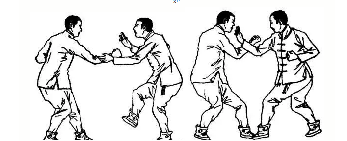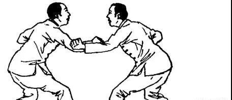 甲向后坐身,两足不动,左手将乙之右胳膊顺着往后捋,谓之顺手牵羊式