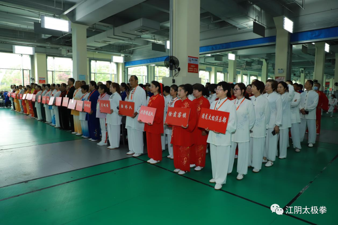 上午8点整,比赛开幕式在庄严的国歌声中拉开帷幕。江阴市武术协会主席、江阴市太极拳协会会长陆钢主持开幕式。江阴市原人大副主任、市老年人体育协会常务副会长龚振东,江阴市老年人体育协会副会长、副秘书长殷文华,江阴市文体广电和旅游局体育事业发展中心主任李宁,江阴市老干部活动中心主任贺栋海、江阴市人力资源和社会保障局综合服务中心主任花晓艳,市武术协会、太极拳协会相关领导及部门负责人出席开幕式。