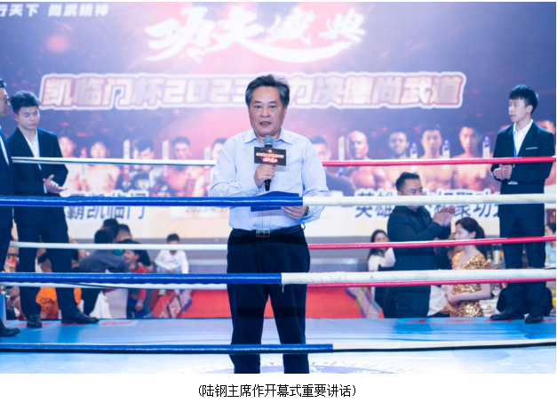 江阴市武术协会主席陆钢出席活动并作了重要讲话,江阴德尚武道刘竞赛作了开幕致辞。国家健将级运动员、世界冠军王志国,亚洲第一大力士王、功夫演员龙武,中国拳坛首位职业重量级拳王、WBO重量级洲际拳王、金腰带持有者姜航,少林武僧一虎等众多武术界领军人士倾情出场,助力赛事。